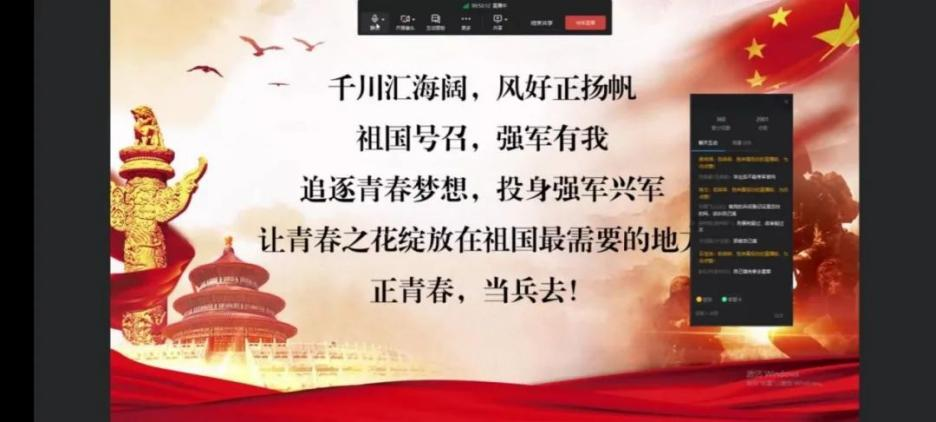 青年强则中国强,风华正茂恰少年,参军报国正当时。为做好老员工征兵工作,广泛宣传征兵知识政策,激发有志青年参军报国热情。下午3点,辅导员赵培杰进行线上国防教育和征兵宣讲