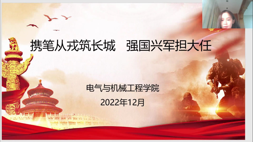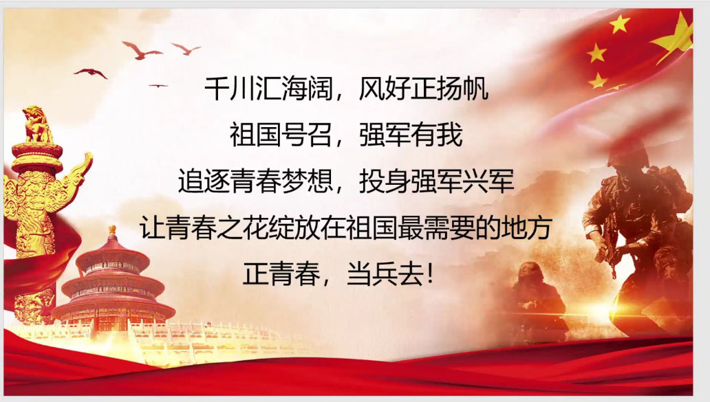 为强化beats365官方网站员工国防观念,号召适龄青年参军入伍,激发老员工投身国防报效祖国的参军热情,2022年12月5日,公司线上召开了2023年度征兵宣讲会,此次宣讲会由辅导员张翘楚主讲,同时邀请了公司优秀退伍学子杨凌和禹浩亮分享军旅生涯,公司全体员工参加。