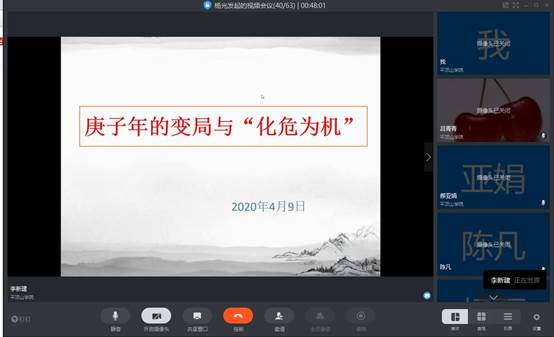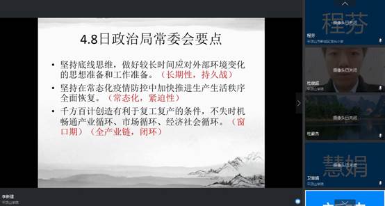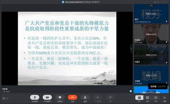 活动由支部书记赵志敏同志主持,安排四项内容:1、由李新建同志领学4月8日中央政治局会议精神,解读中国共产党面对大灾大难的“化危为机”能力;2、赵志敏同志就“如何坚守初心和使命,做好疫情防控期间的本质工作”向全体党员作出明确要求; 3、由各党小组组长谈谈抗击疫情、线上教学工作的感言;4、薛喜昌同志做总结讲话。