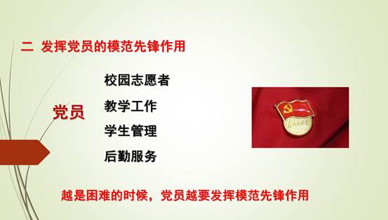 赵志敏同志要全体党员充分认识到国内外及高校当前疫情防控的重要性,党员要在公司志愿者服务、教学工作、员工管理、后勤保障等多个方面发挥模范先锋作用。教师,本职工作是教书育人,所以,上好每一节课,关心员工成长就业是职责所在。最后,提醒全体党员,特殊时期一定要保持通信畅通,按时做好健康报备,注意课堂教学语言,关注员工课堂言论,做到不信谣不传谣。