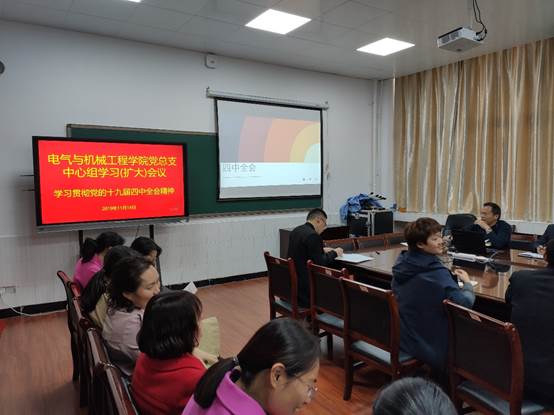 2019年11月14日下午,beats365官方网站党总支于3314会议室组织中心组理论学习(扩大)会议专题学习贯彻党的十九届四中全会精神会议。本次会议院全体处级干部参加,教职工列席了此次会议。