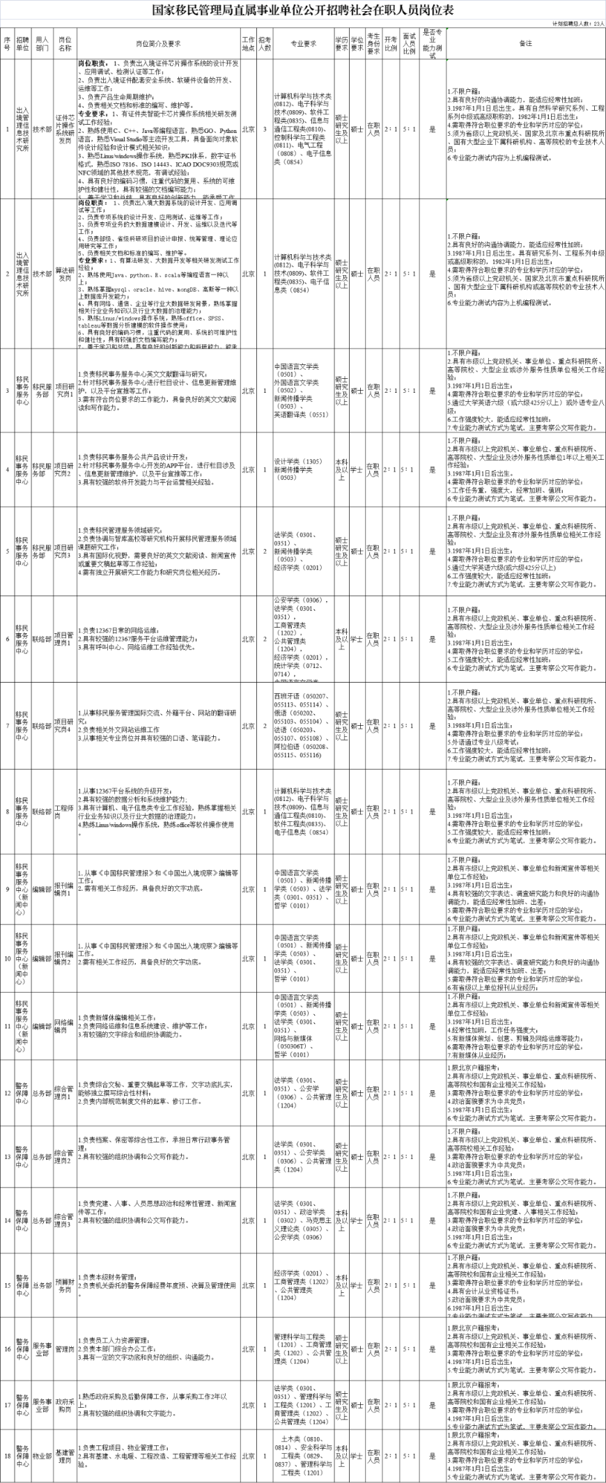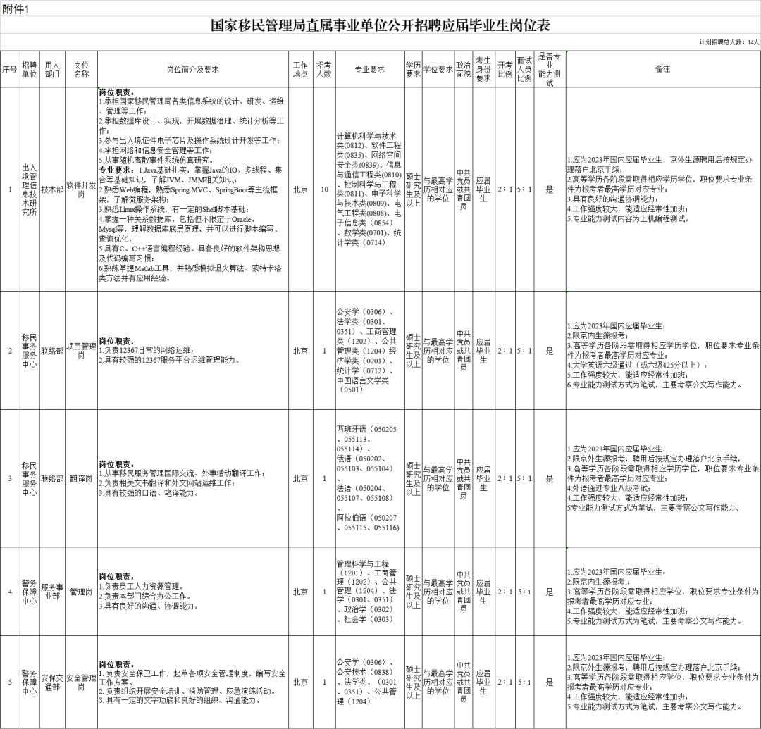 具体岗位详见《国家移民管理局直属事业单位公开招聘应届高校毕业生岗位一览表》和《国家移民管理局直属事业单位公开招聘社会在职人员岗位一览表》,有关岗位专业条件参考教育部《授予博士、硕士学位和培养研究生的学科、专业目录(1997年)》《普通高等公司本科专业目录(2020年)》《学位授予和人才培养学科目录(2018年)》。对于所学专业接近但又不在上述参考目录中的,应聘人员可与招聘单位联系确认应聘资格。